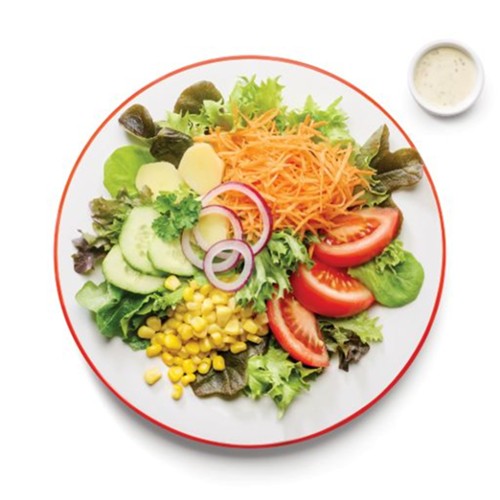 Salade accompagnée de morceaux de concombre, tomate, maïs, carotte râpée, patate, oignons rouges, et une touche de persil
