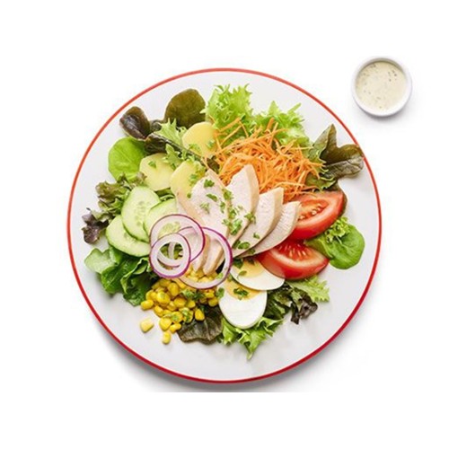 Salade accompagnée de morceaux de poulet, d'oeuf, concombre, tomate, maïs, carotte râpée, patate, oignons rouges, et une touche de persil